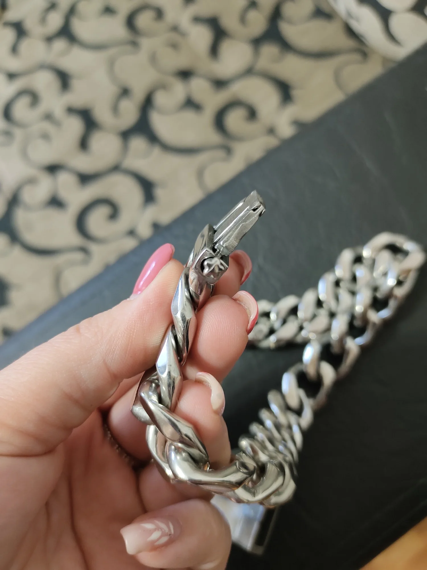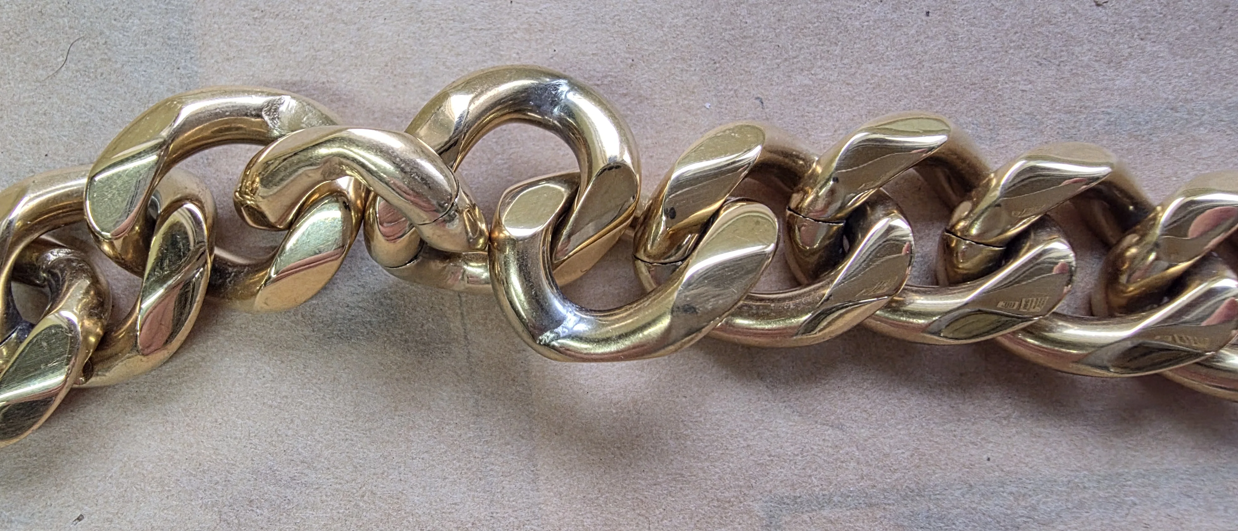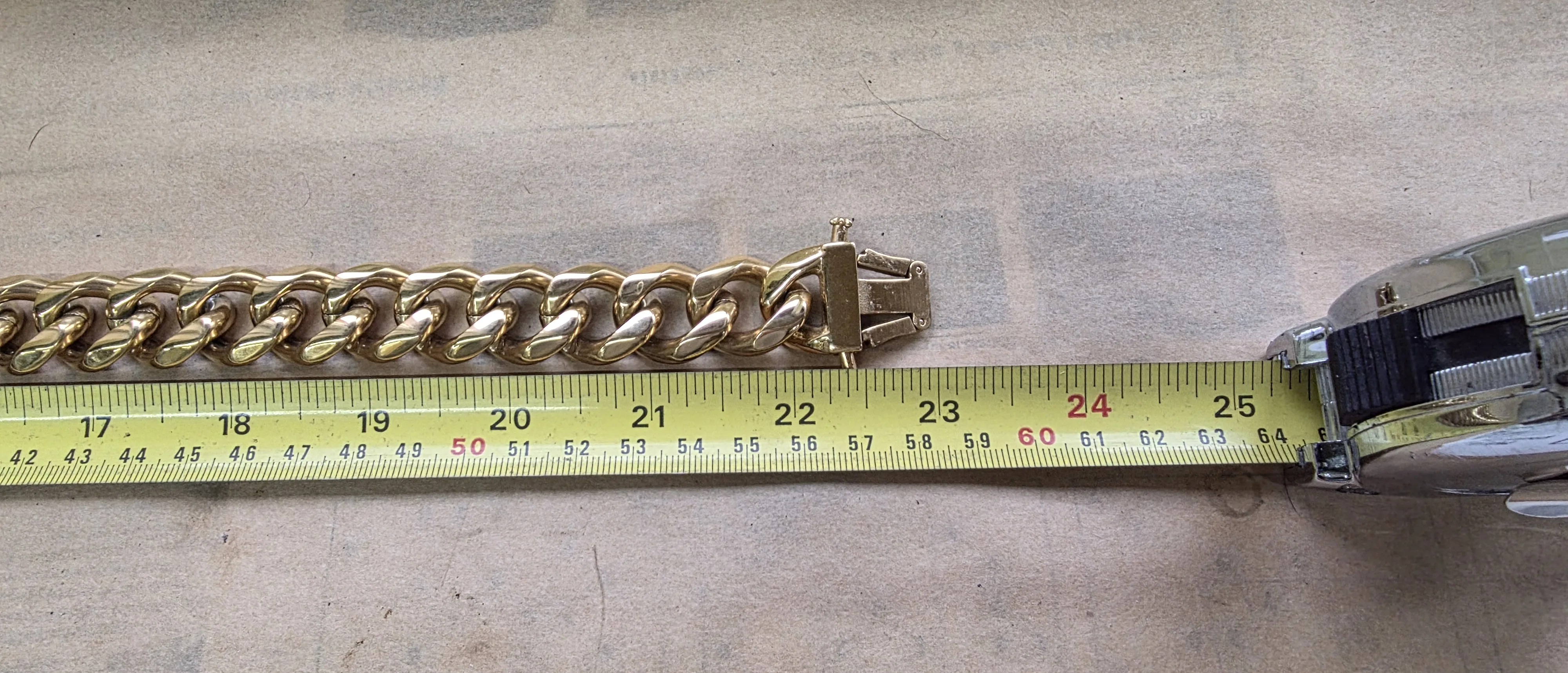 Beautiful gold and without mistakes. Firm and correct weight. Closes tightly. Fits perfectly around the neck of my Dog.