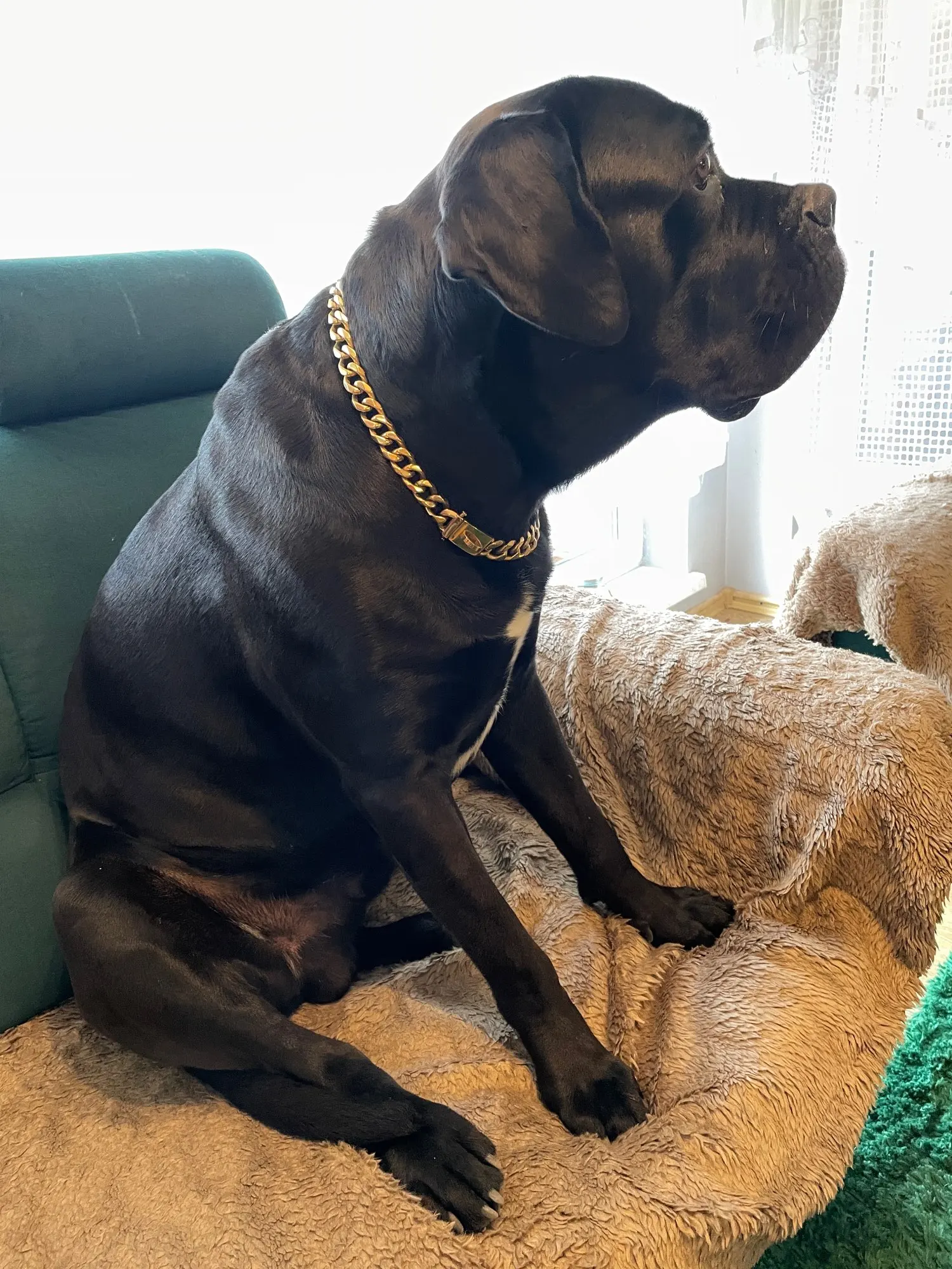 I ordered the 51-55cm chain, but it measures 57cm so it's a bit loose. But chain links can be removed by the looks of it. It does weigh a fair amount and looks the part, although if links are twisted the gold plating isn't covering the link contact points. But it does look nice on a black lab.
