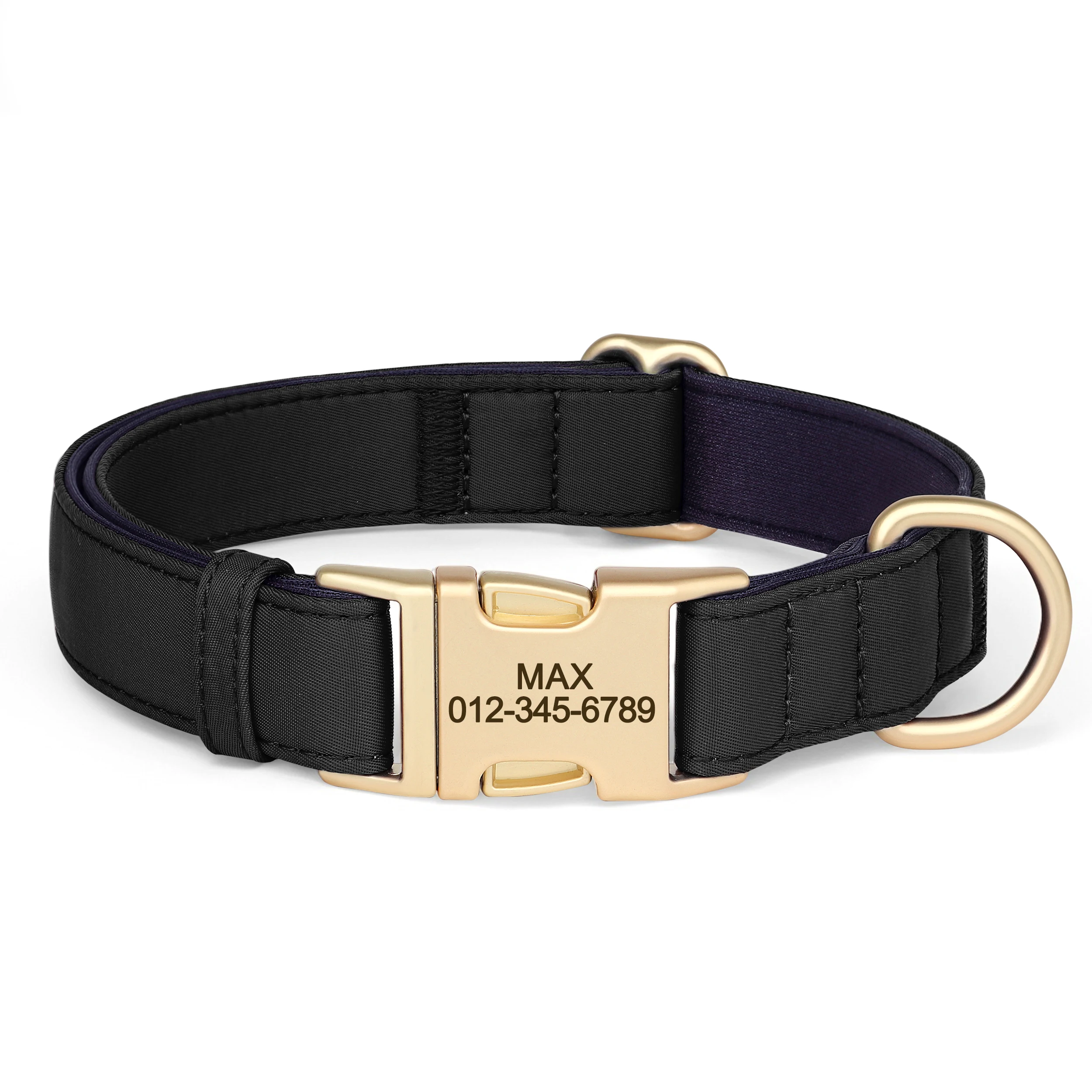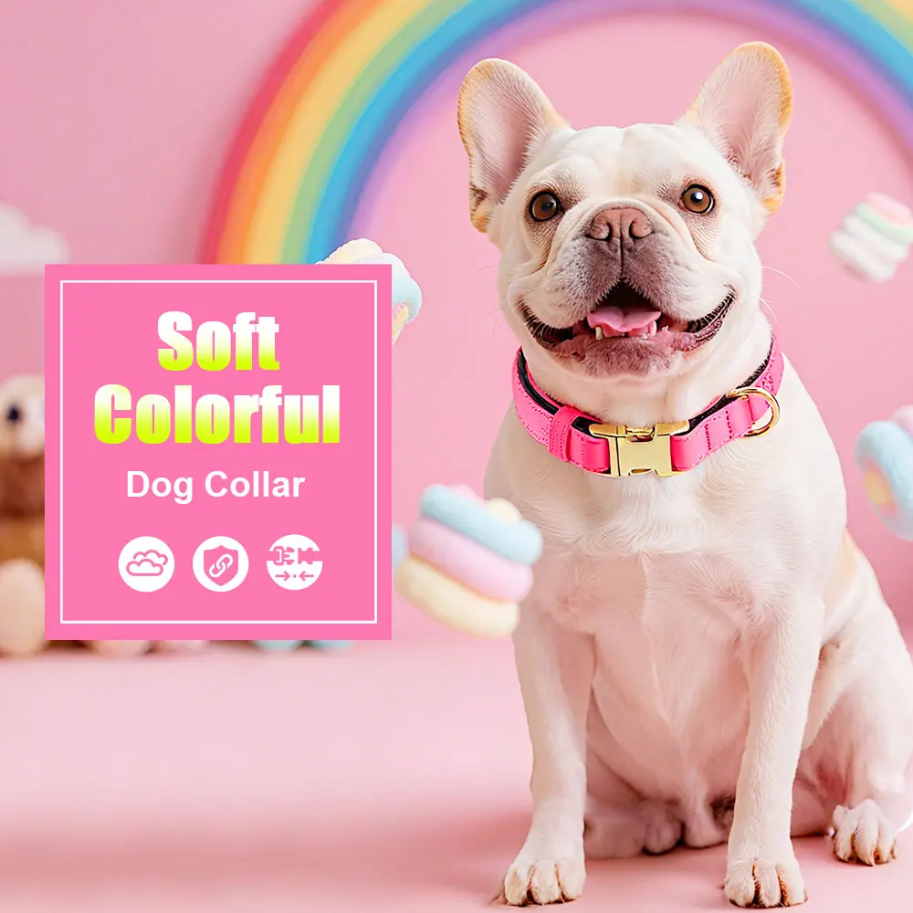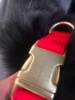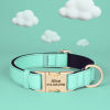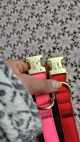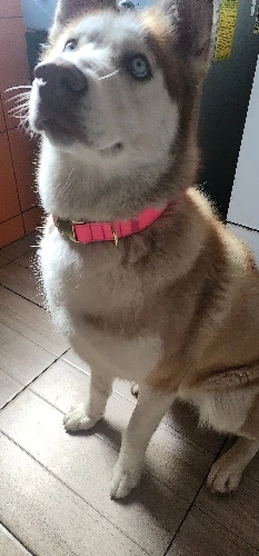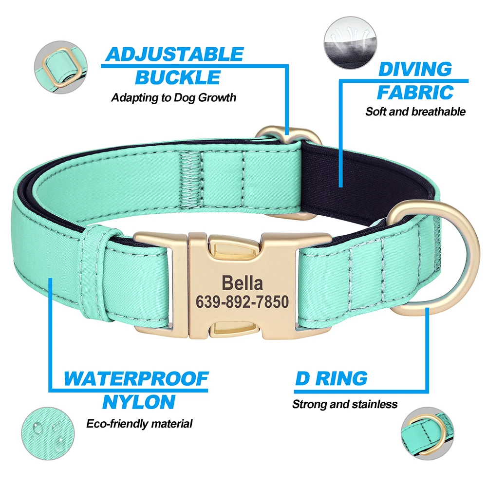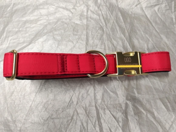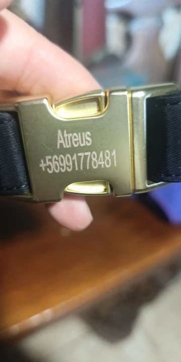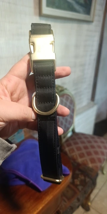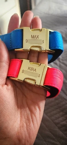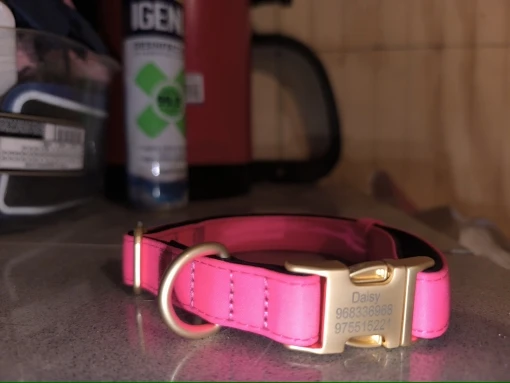 cool soft beautiful collar metal buckle logo dog name and mobile phone internal side of the collar probably not sure about waterproof the collar is getting big in