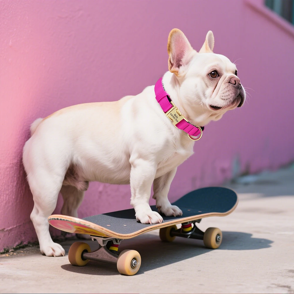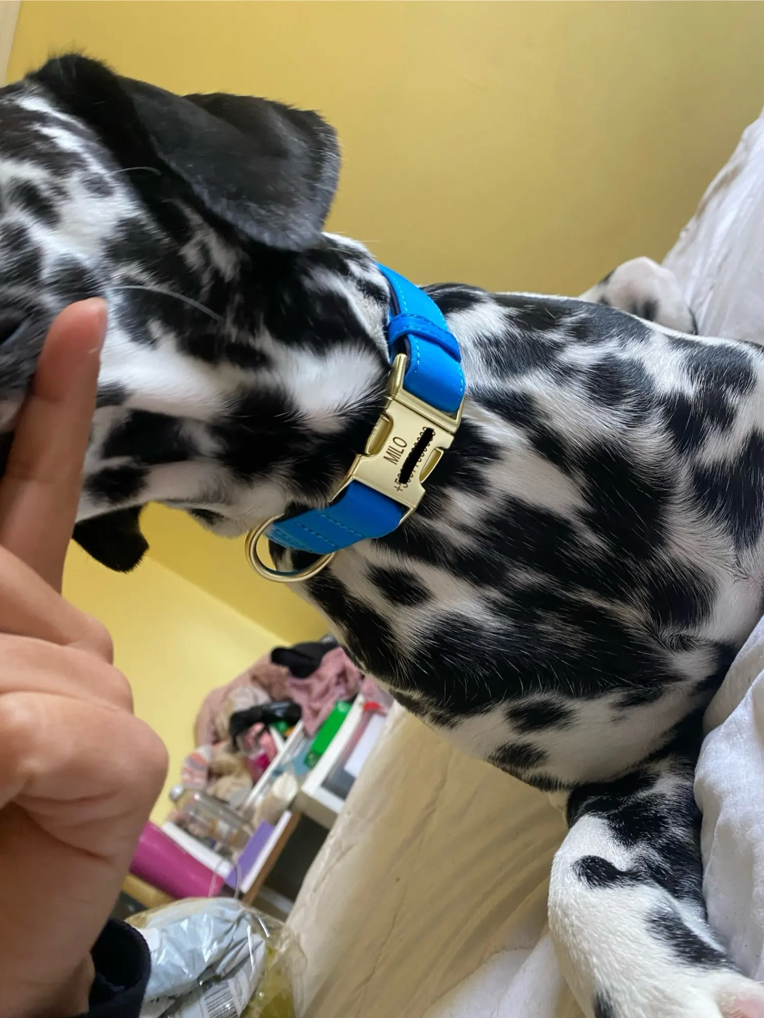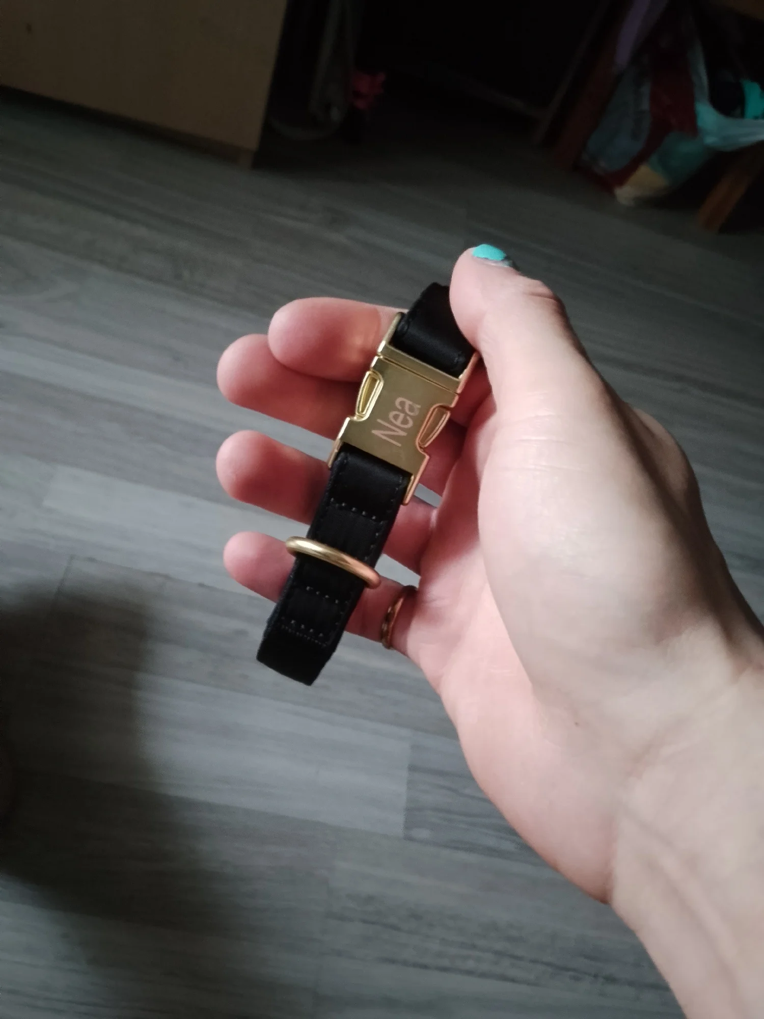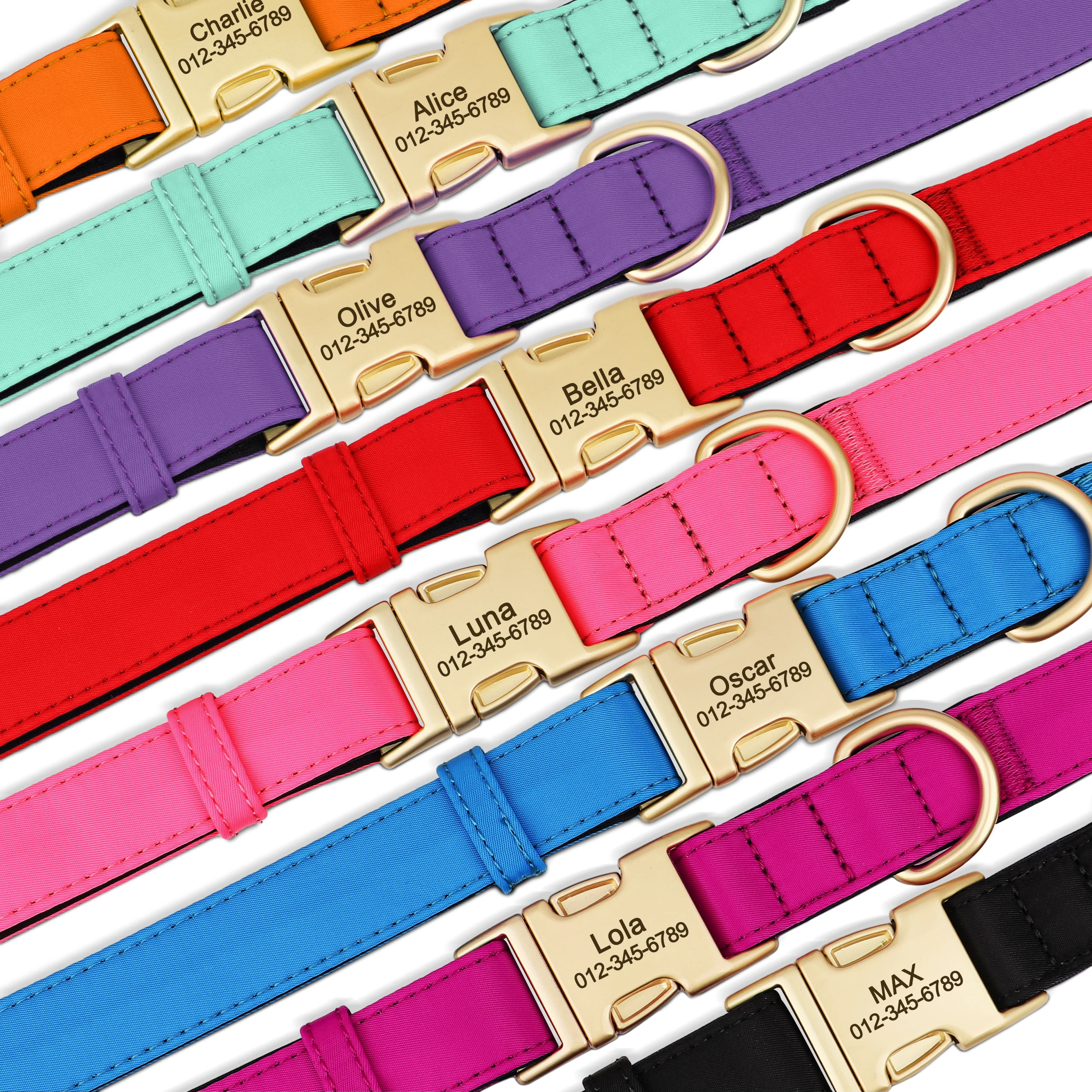 cool soft beautiful collar metal buckle logo dog name and mobile phone internal side of the collar probably not sure about waterproof the collar is getting big in