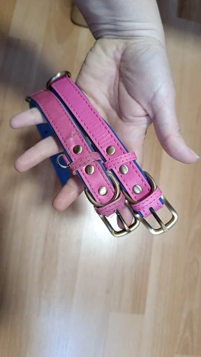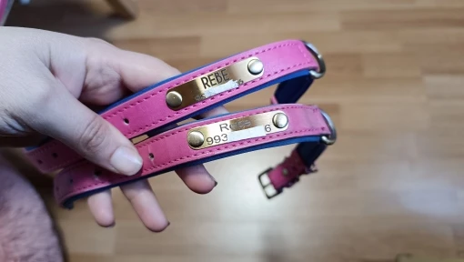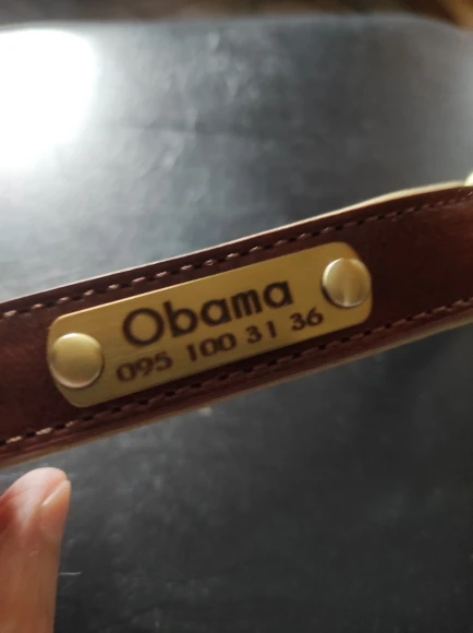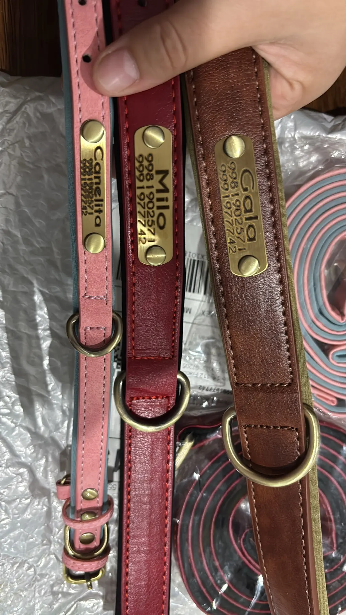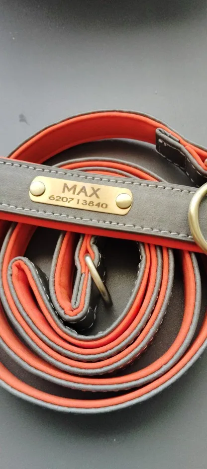 Very cute and very good quality, the inside of the necklace is padded, the size guide is perfect if you follow it you shouldn't have any issues with the size. Of all the collars I have bought for my dog, this is the one that has lasted the longest (more than 1 year). This is the second collar I've bought for her; after just over a year of daily use, it's really good. The only thing that looks different is the color and some damage from use, which is why I bought another one (I'll leave comparative photos). The strap measures approximately 150 cm, which is an appropriate length and is made of the same material as the necklace. The stitching looks great and is very sturdy. The engraving on the plaque is an engraving, not paint; it does not smudge or fade, which is excellent.
