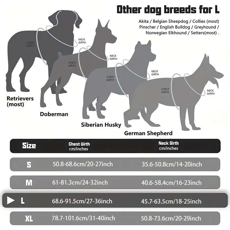 I took the l size, for a 32kg golden retriver. The harness is good, it can be adjusted.