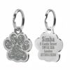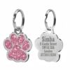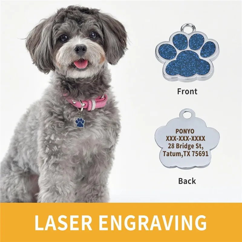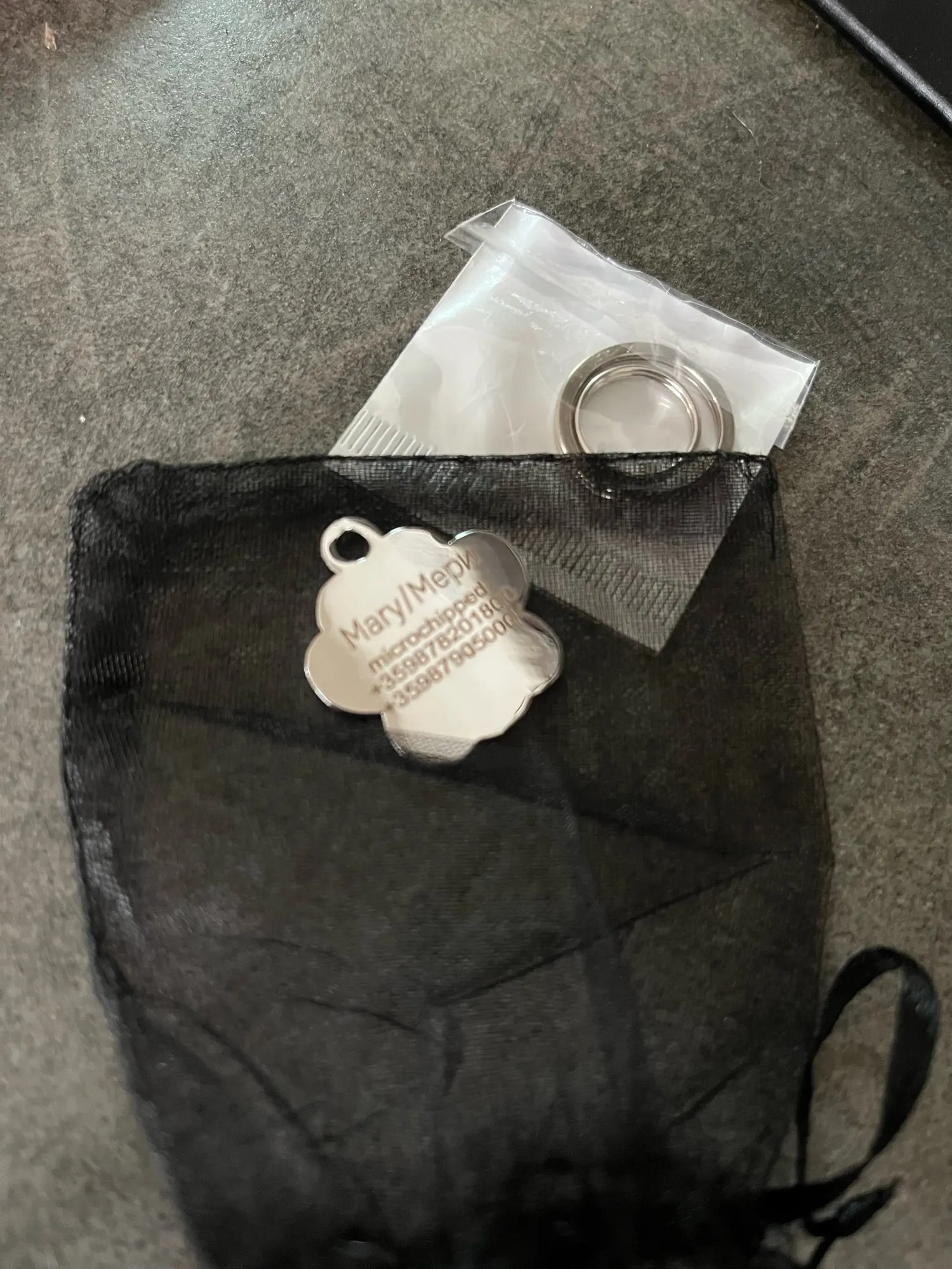 Perfect form, not too big, not too little. For big and little dogs. It comes with two different ring. One bigger, one more little. You can choose. Quality very high. Shiny, stainless steel, laser engraved name and phone number. If you want also your address and more. You can position the text. For the price very good. Violet is not on these pictures, but it also looks perfect and like the image of the product.