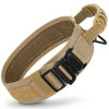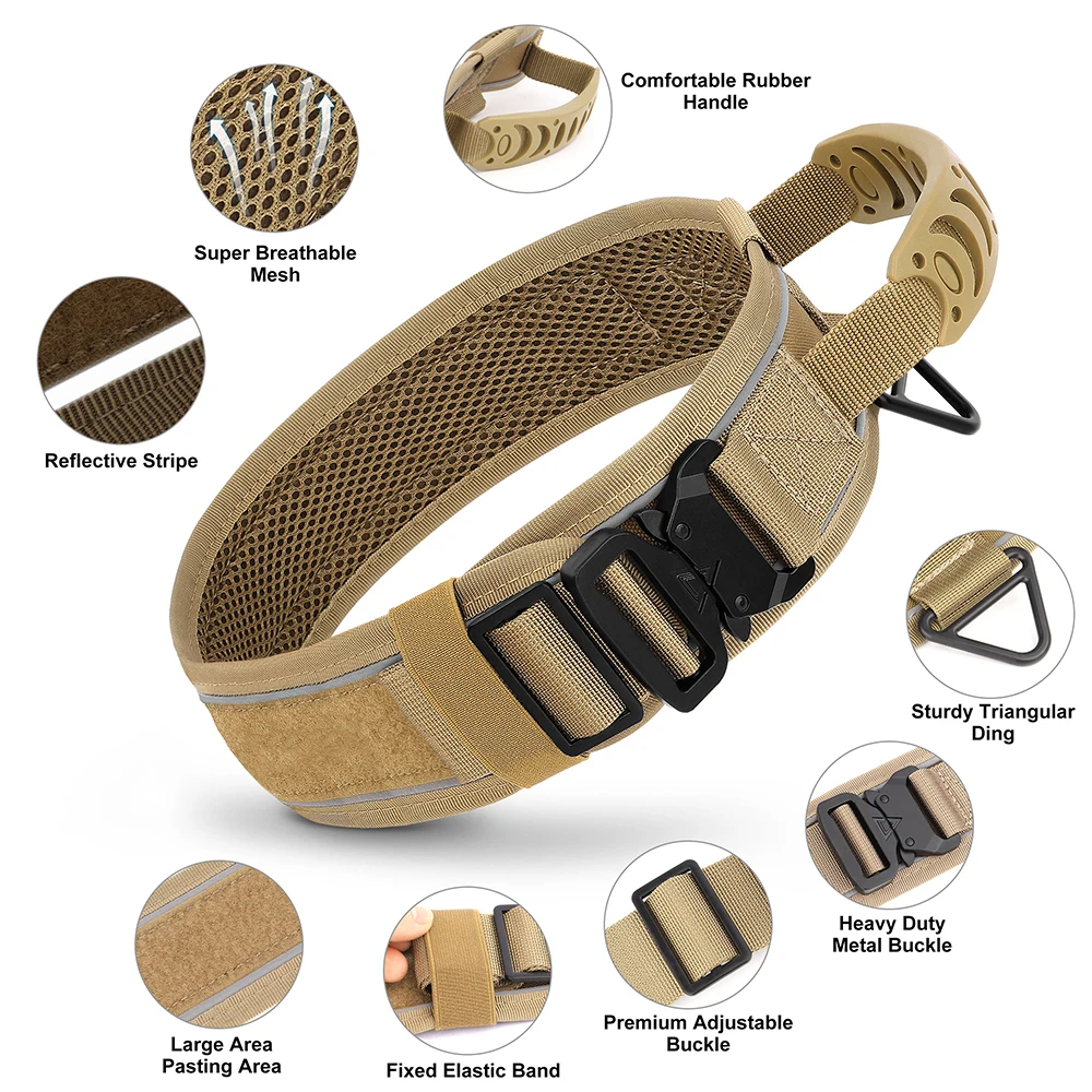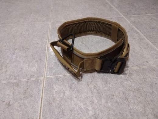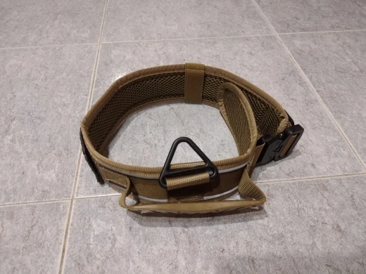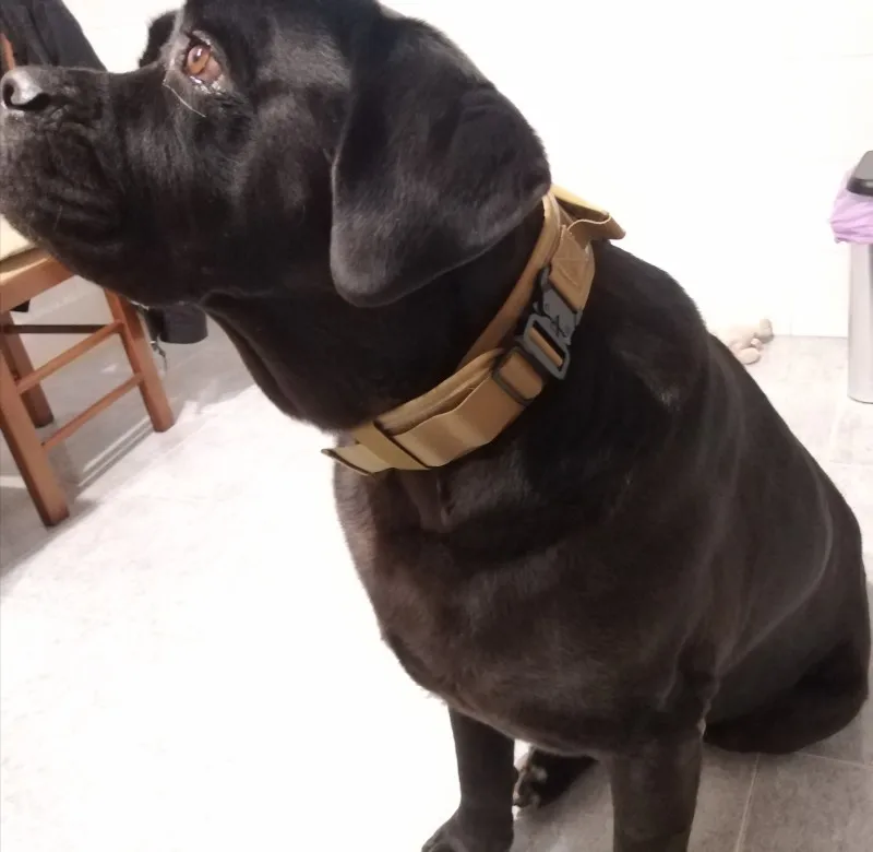 Finally found a wide tactical collar for my dog with an easy-release buckle! It seems quite sturdy, though time will tell on durability. One downside is that they didn't mention the size of the Velcro patch area in the description--I would have ordered a custom name patch at the same time if I'd known. For reference, the Velcro area on the size L collar measures 23x4 cm. Overall, a solid collar that looks great and is functional for training!