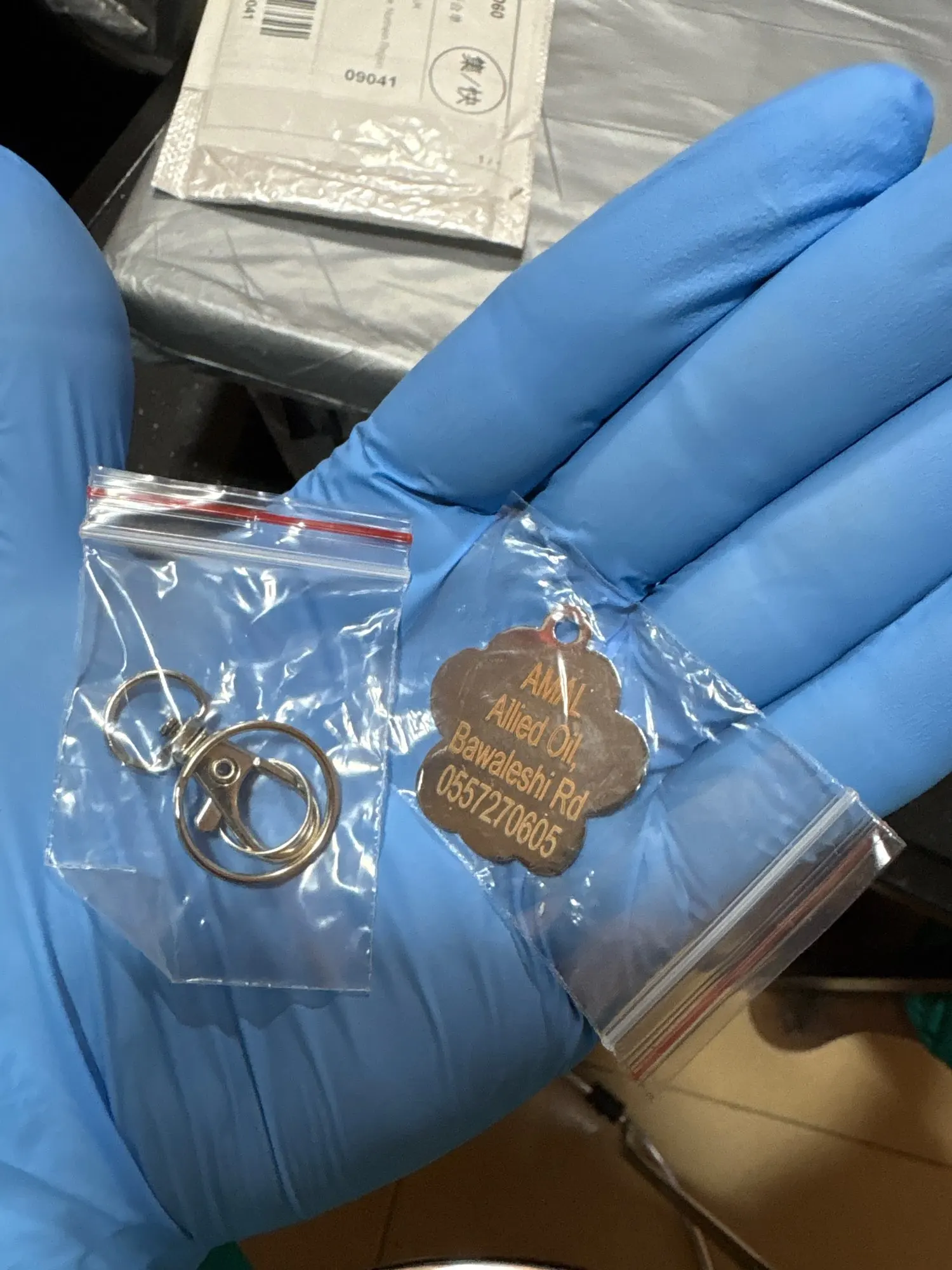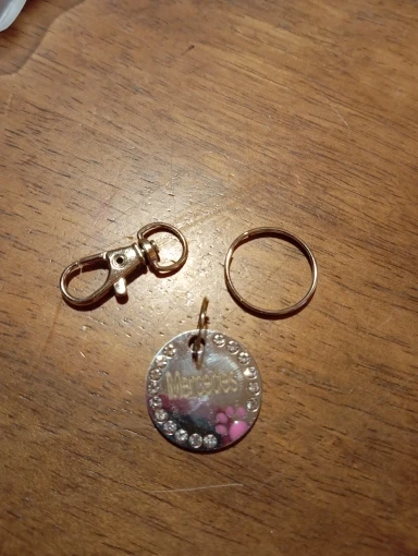 The product was delivered on time, a very beautiful keychain for my dog. Thank you. Now I feel at ease, if it gets lost somewhere, it can be found by the keychain.