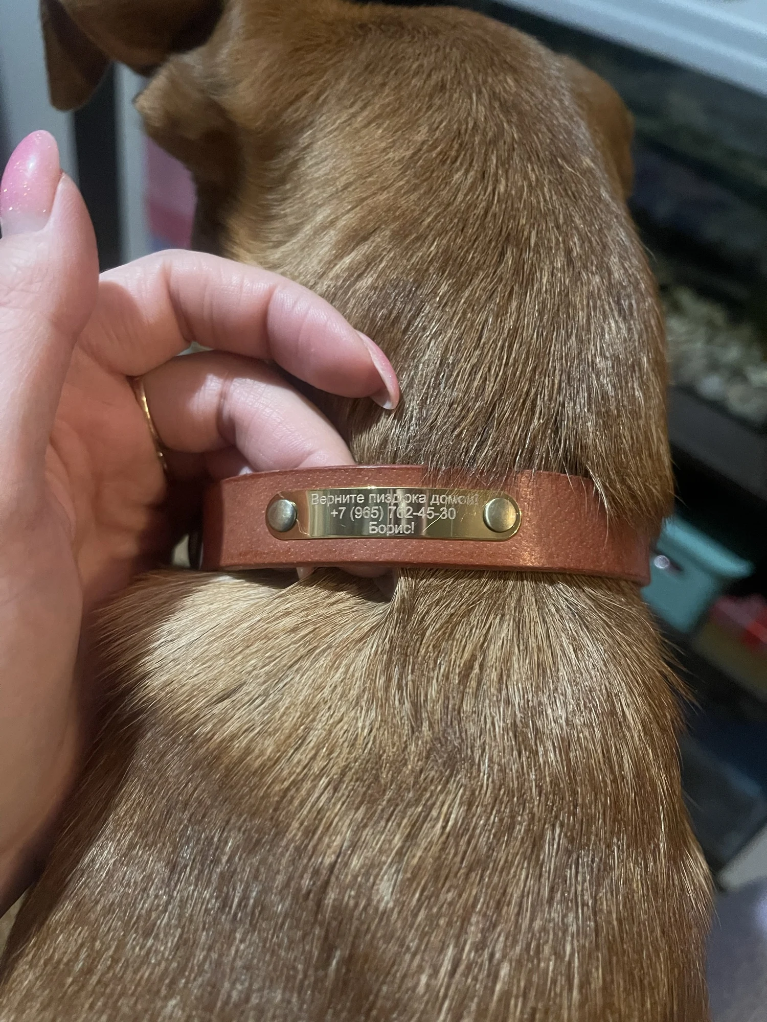 Amazing collar. Genuine leather. Arrived quickly. The inscription is fire. I recommend the seller.