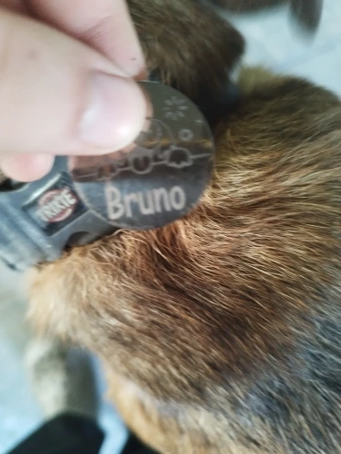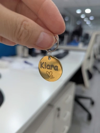 Just like in the photo, a personalized tag for cats, although I find it a bit large. It came perfect with the name and description I requested on the back and the letters in a good size.