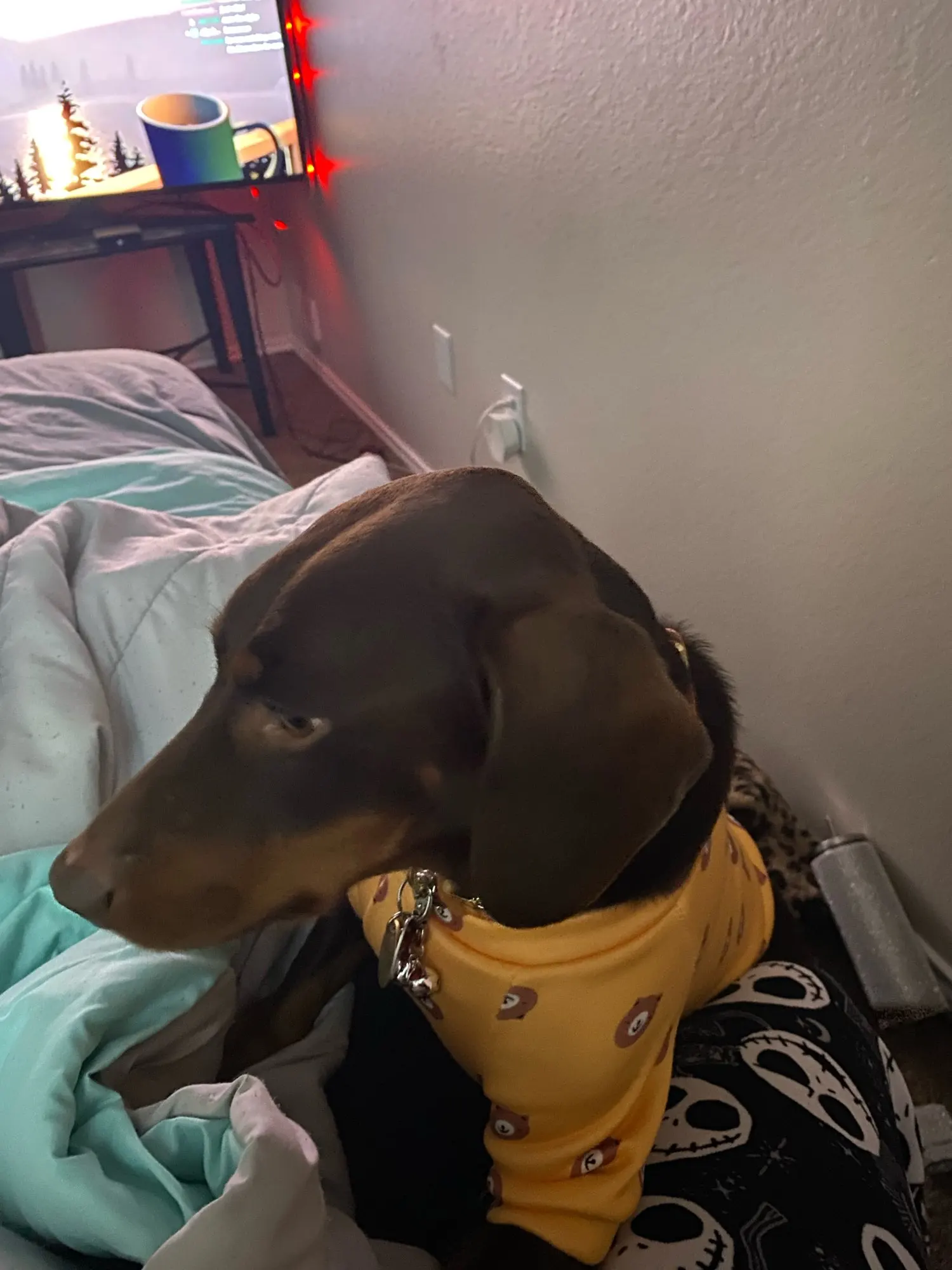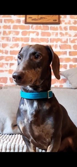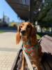 fits my adult dachshund it is less thick than i expected but quality is still great and the customization is so cute and was easy to set up