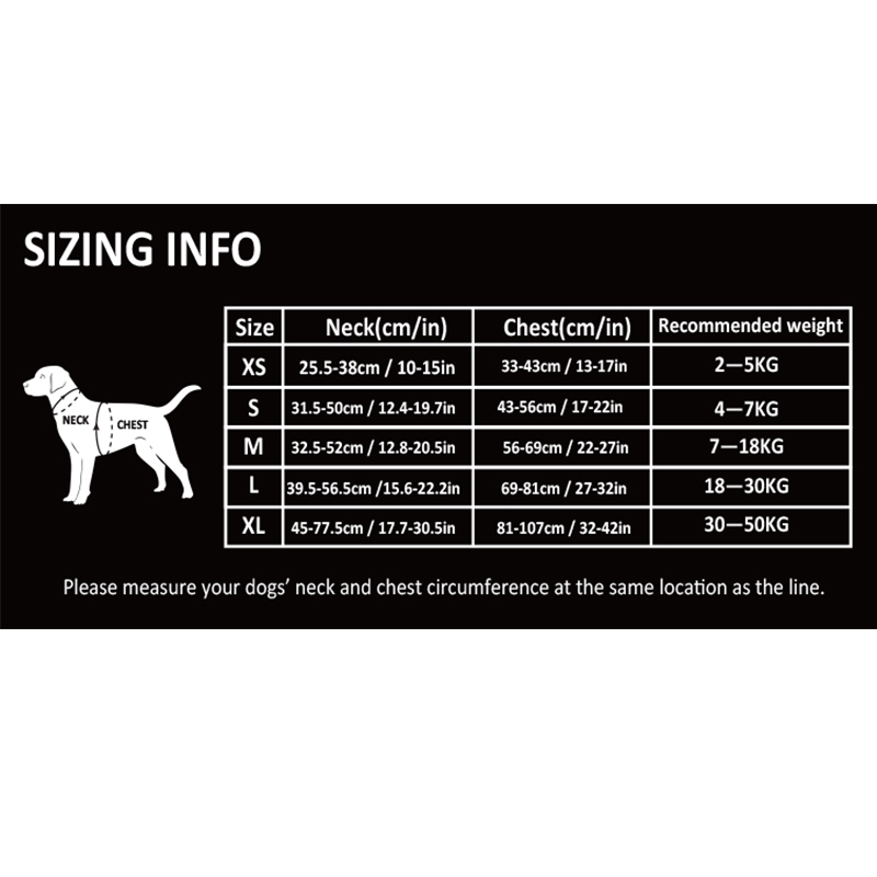 Noted: the size in the chart is the size of the dog. Due to different measurement methods, the size may vary by 2-3 cm.